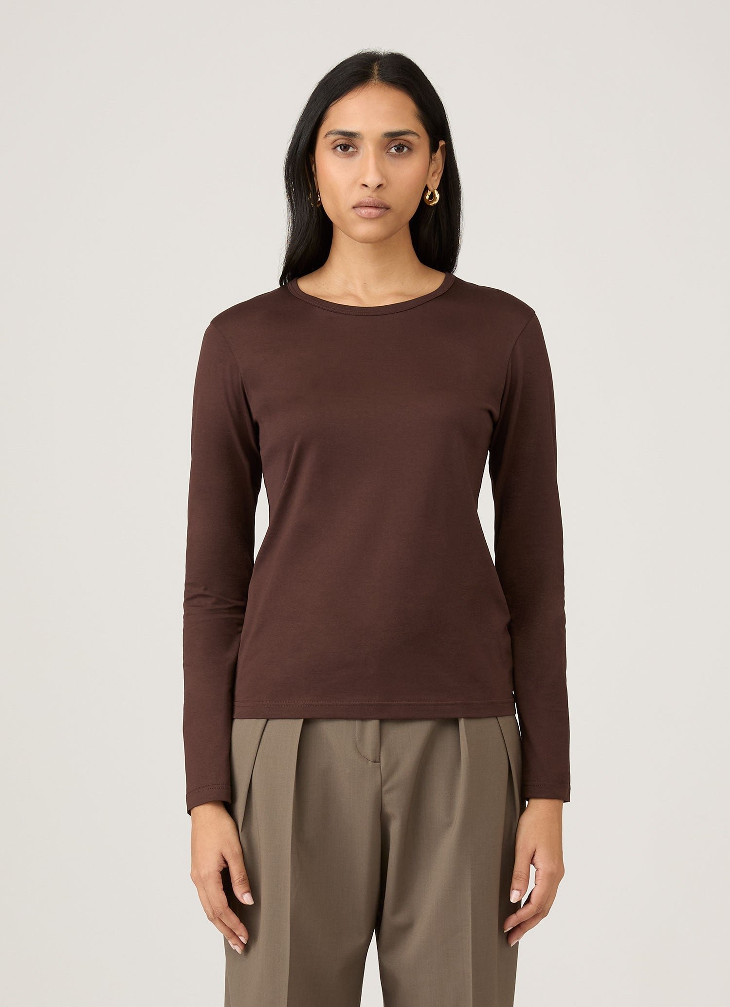 クラシッククルーネックと同じシルエットの、すっきりとしたスリムなフィット感の長袖バージョン。サンスペルが誇るスーピマコットンジャージーは、柔らかい肌触りで快適な着心地をお楽しみいただけます。重ね着に一枚欲しいときに最適なアイテム。スタイリングの選択肢は無限大です。