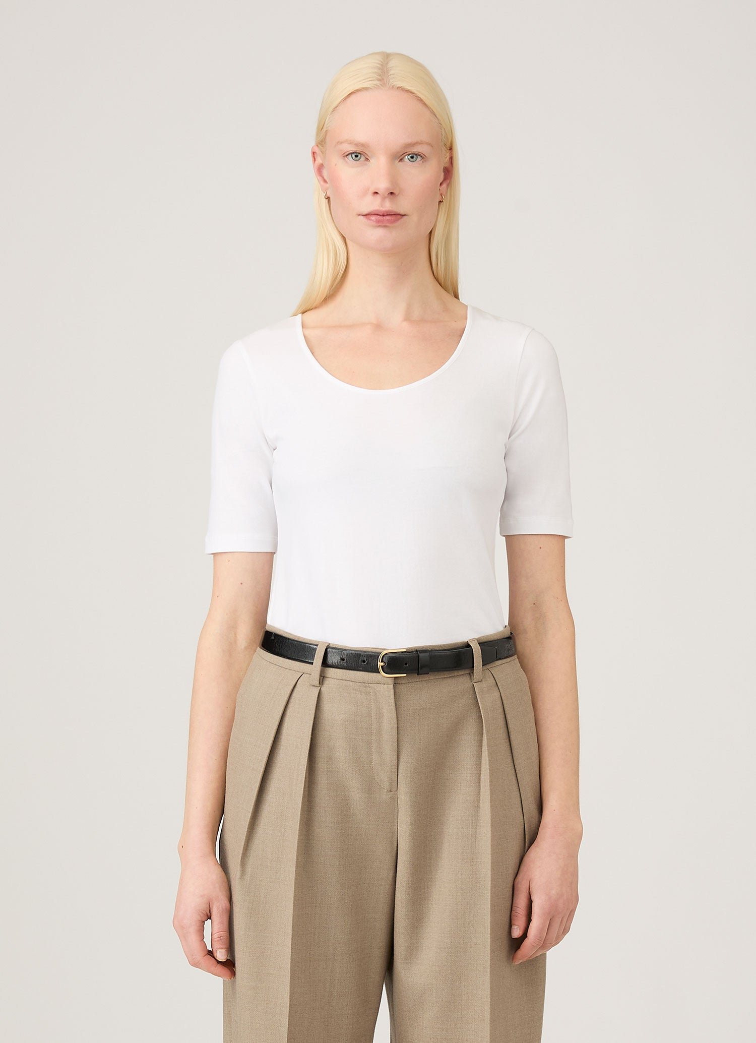 わずかに伸縮性のあるコットンジャージーを使用した、エレガントで快適なスクープネックのトップス。スリムなフィット感で、朝から夜のお出かけまで一日中楽しめる万能アイテムです。